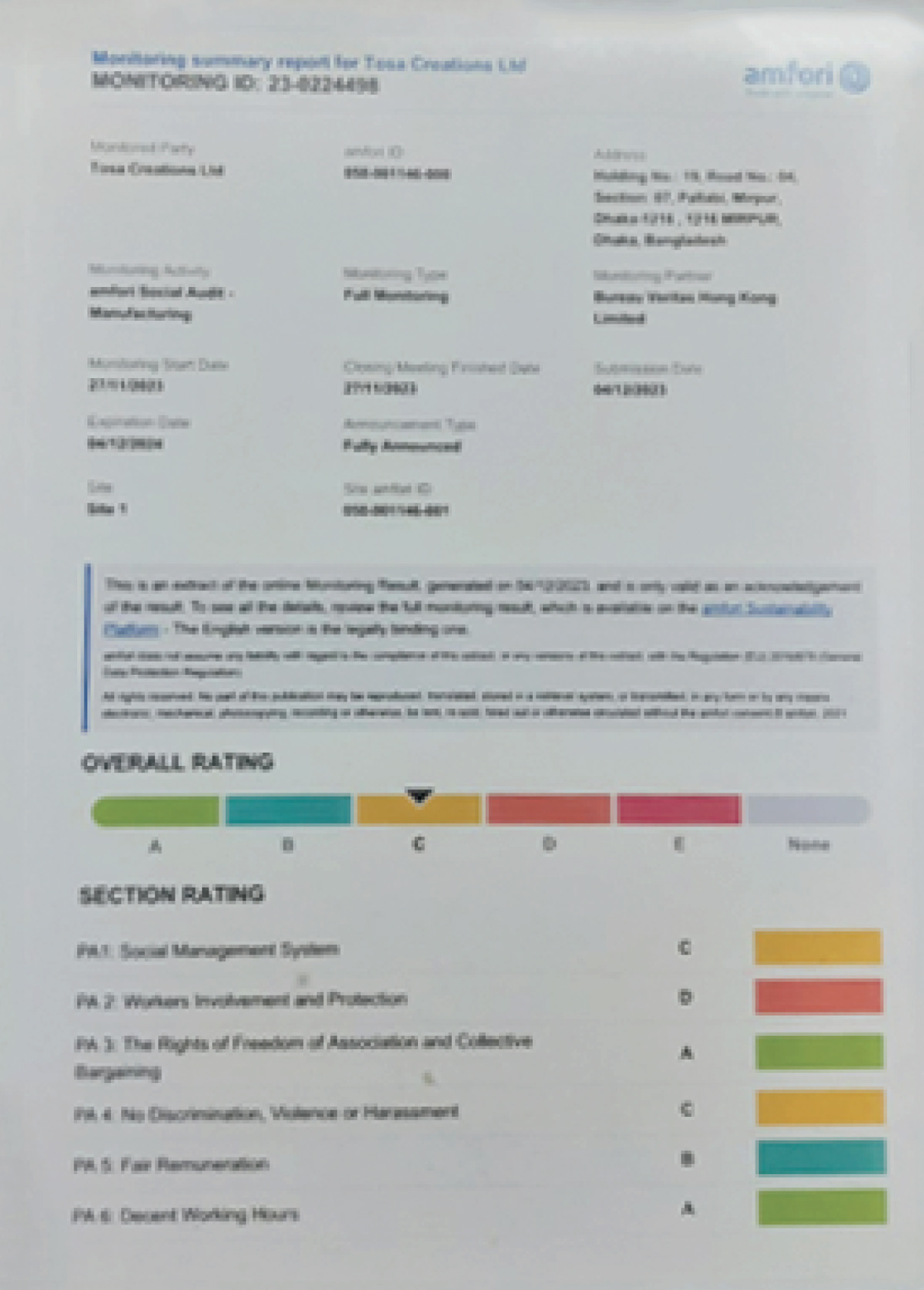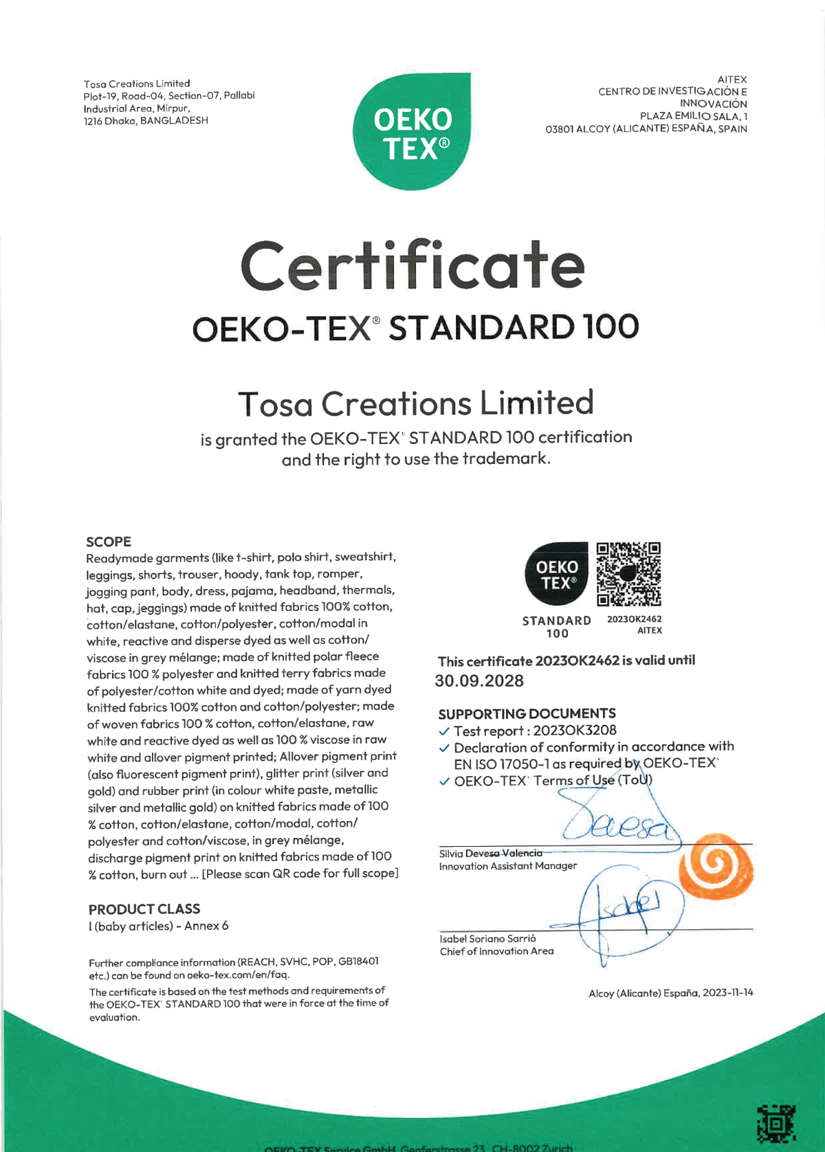 Each certification reflects a promise: that our workers operate in fair, safe, and ethical environments, that our processes are transparent and accountable, and that our quality management systems are continuously improving to meet international expectations. Our sustainability-driven initiatives, supported by these certifications, ensure that we minimize environmental impact while maximizing customer satisfaction. Together, they reinforce our identity as a trusted global apparel partner, empowering brands worldwide to work with confidence, knowing that every Tosa Creations product is backed by certified quality and integrity.